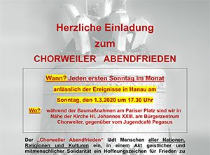 Der Chorweiler Abendfrieden findet für gewöhnlich auf dem Pariser Platz in Köln Chorweiler statt. Da dies allerdings aufgrund der aktuellen Corona-Situation nicht möglich ist, fand der Abendfrieden am 05. Juni 2020 in veränderter Form kurzfristig im großen Saal des Bürgerzentrums Köln Chorweiler statt. Hier können Sie den Abendfrieden vom 05. Juni 2020 nacherleben. Vielen Dank… Continue reading→